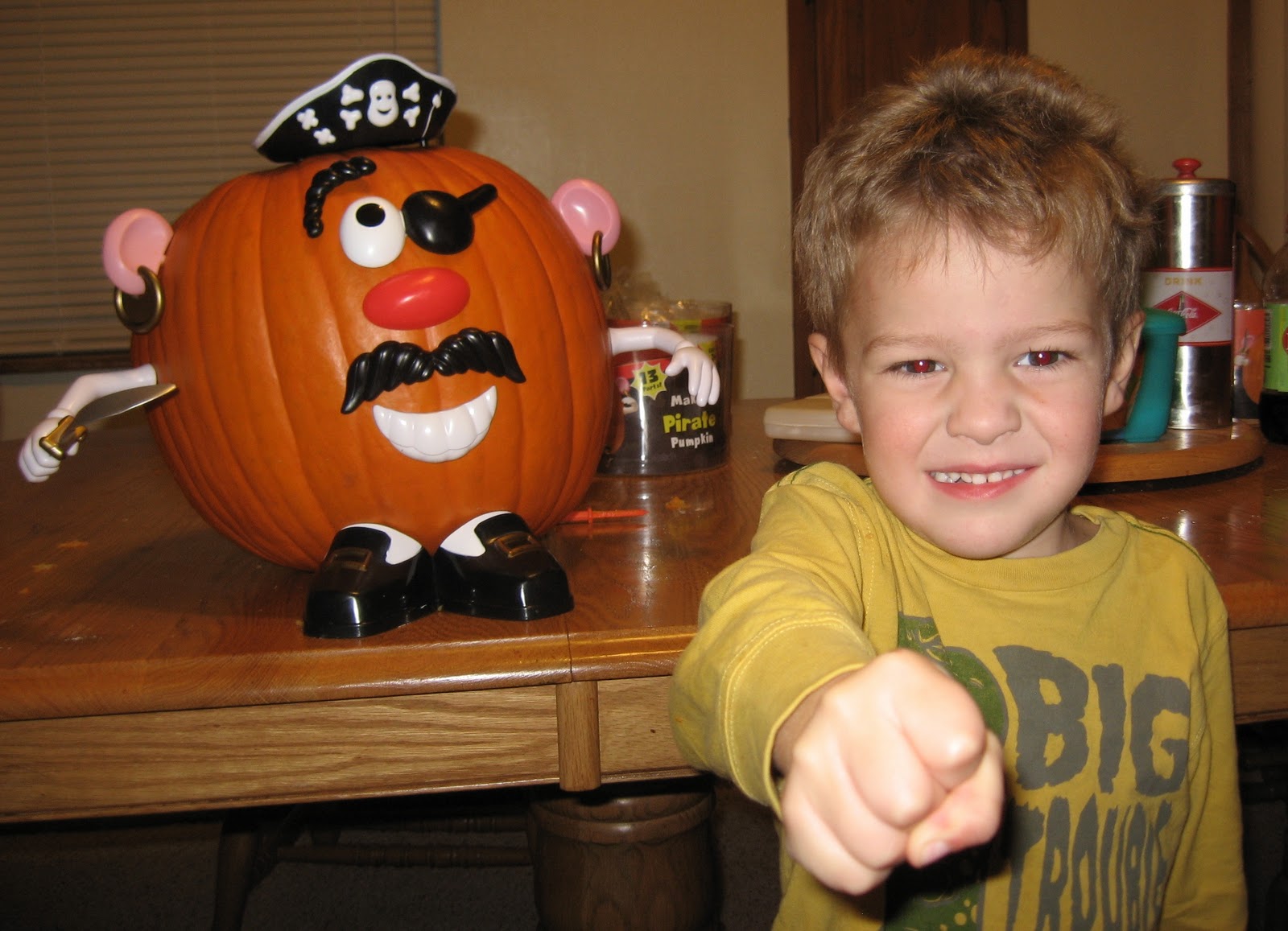 Yes, we decorated more pumpkins...we had a total of nine pumpkins out in front of our house. The four little ones from the last post, these four "Mr. Potato Head" pumpkins, and a jack-o-lantern you will see in a little bit. We let the kids pick which kind of Mr. Potato Head parts they wanted. Two of them picked pirates and the other two picked skeletons.
